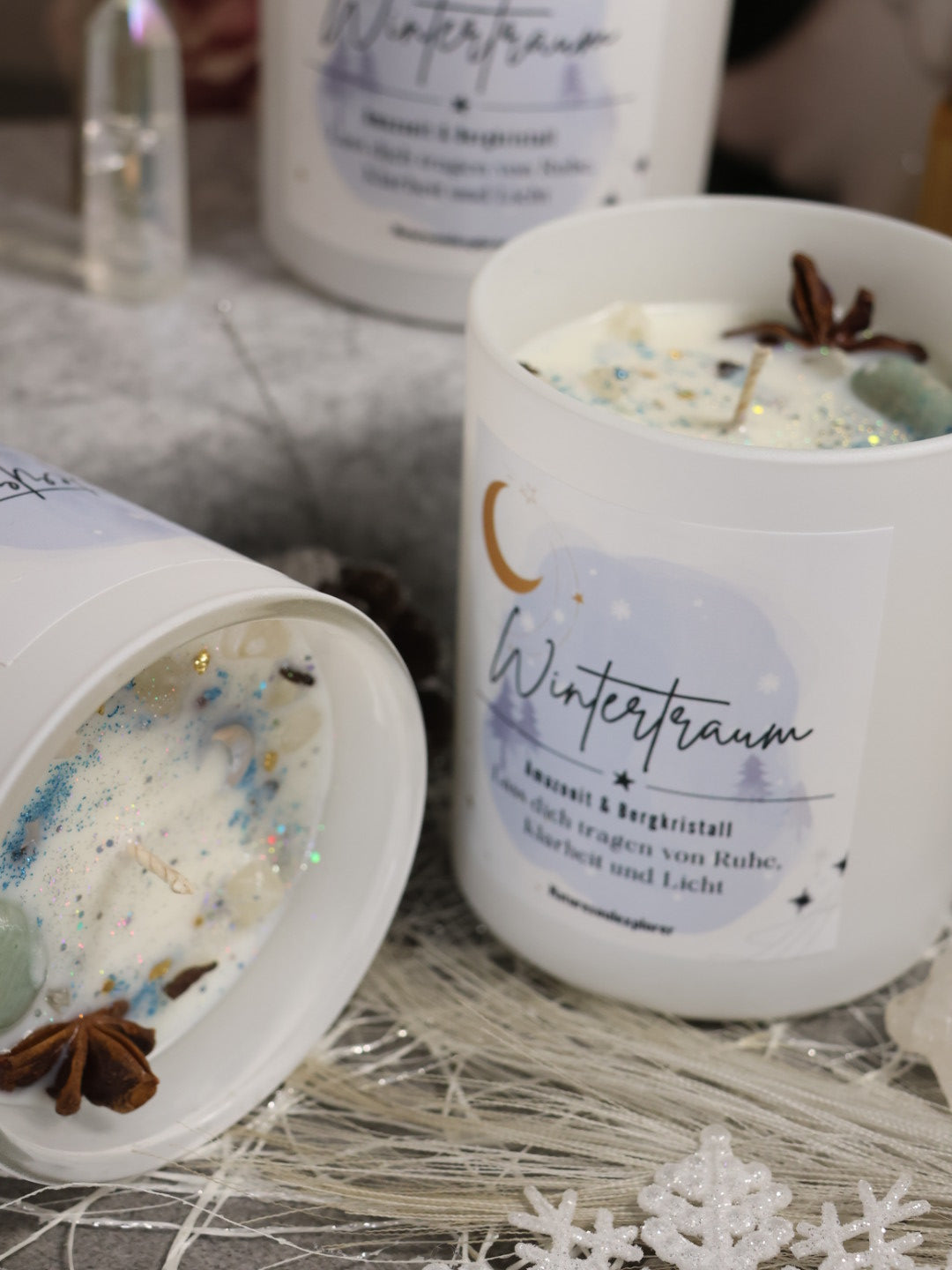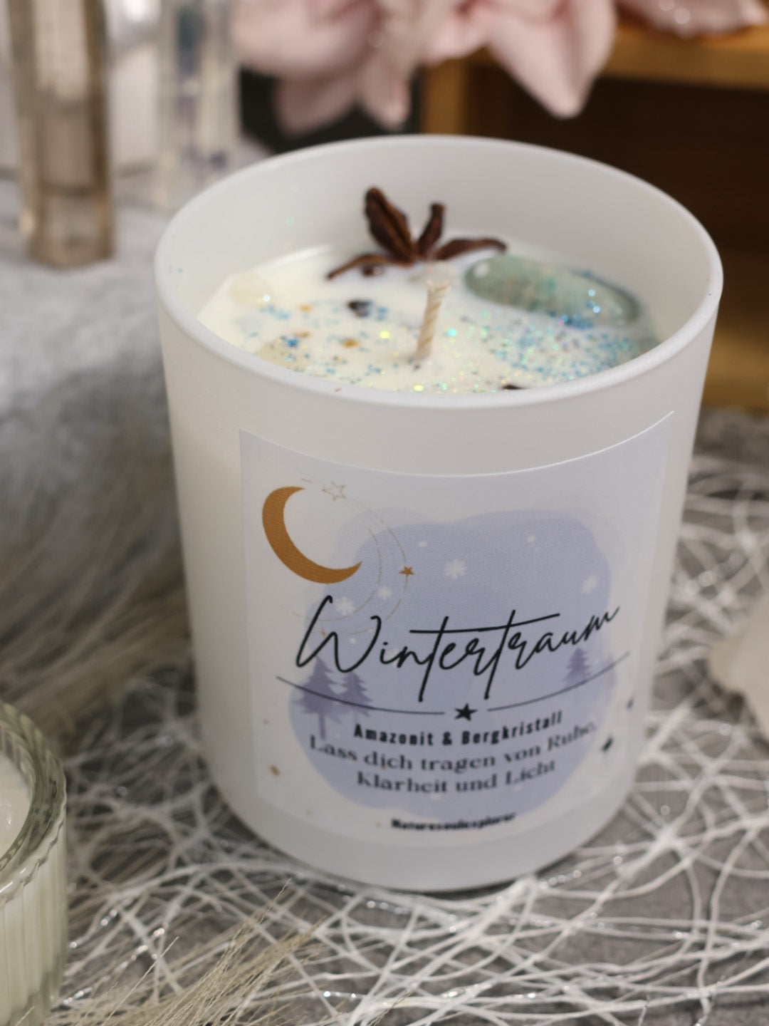 Zwei Begleiter aus Licht und Stille – Amazonit und Bergkristall – ruhen in dieser Kerze und entfalten beim Entzünden ihre sanfte, harmonisierende Energie.